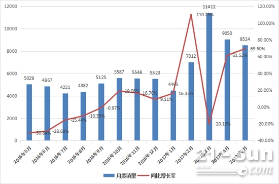 2017年5月,國內25家主要裝載機生產企業合計銷售各類裝載機8524臺,同比去年5月份5029臺,大幅增長69.50%。最近8個月來,裝載機有7個月實現同比正增長(僅3月份下滑20%);今年1-5月份,裝載機累計銷量為40493臺,同比增長約26.06%,市場持續升溫。